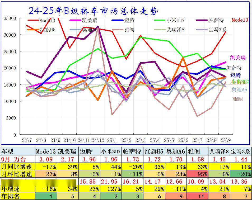 B级轿车2025年9月批发36.73万台,占批发份额32.54%,批发较去年同期同比增长8%,批发环比今年上月增长6%;2025年9月零售较去年同期同比增长8%,零售环比今年上月增长8%。2025年1-9月批发数量290.38万台,厂家批发销售累计增幅6%;2025年1-9月国内零售数量269.6万台,零售累计增幅9%。