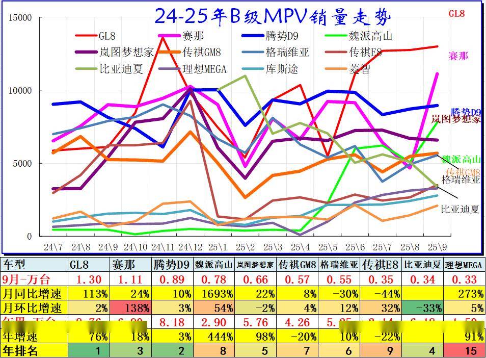 MPV市场的高增长阶段已经改为低增长趋势。GL8近期表现较强,比亚迪、腾势和传祺的MPV表现超强,日系的MPV优势迅速下降。