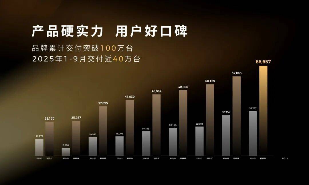 向着高端化品牌升级,零跑的基盘是2025年前三季度近40万辆的交付成绩,让这个曾经的“挑战者”积累了足够的底气。朱江明在群访中透露:“零跑今年全年至少完成去年定的50万辆的目标,一定可以提前达成。”更重要的是,零跑在9月份创下了单月交付66657辆的新纪录,首次突破6万辆大关,展现出强劲的增长势头。