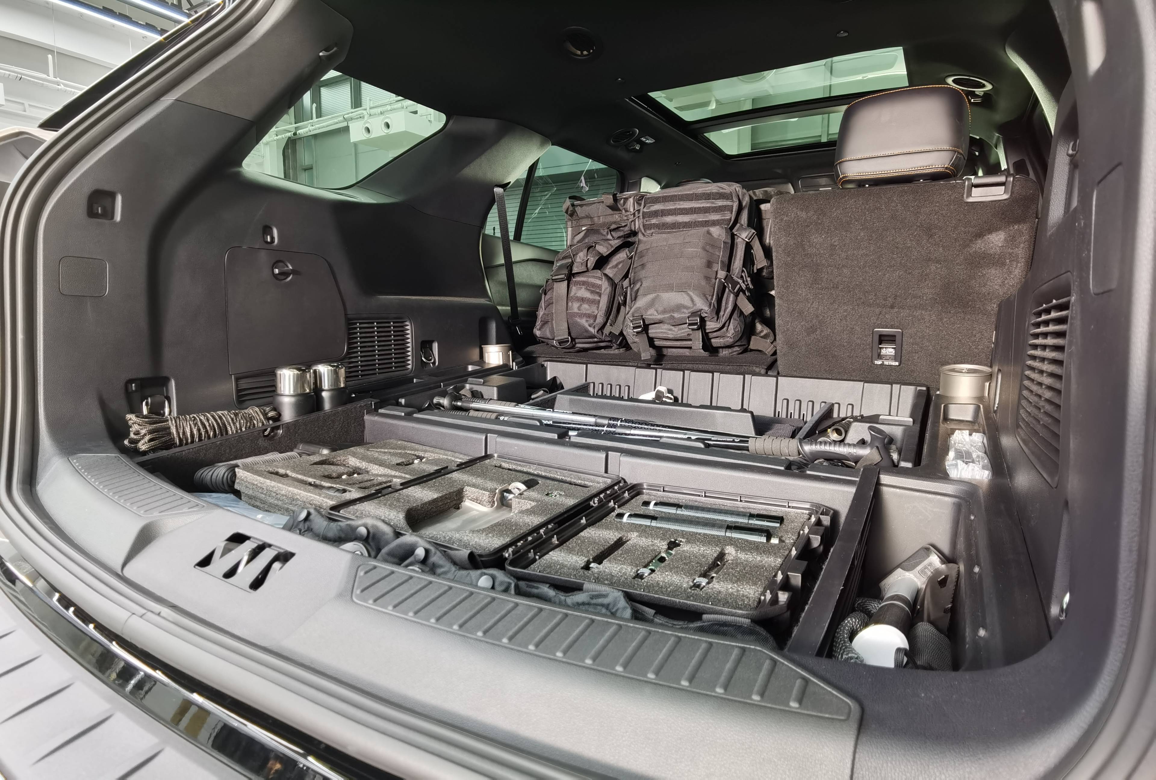 昆仑谱系用的是 18 寸全地形胎,昆仑穿越版是 5座车型,后备箱精细化分区储物,行李地毯下方拓展近100升空间,可装下更多户外工具用品。