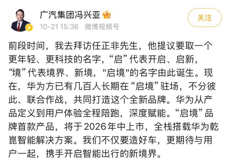 “这款车承载着‘再造一个新广汽’的使命。”这是10月21日广汽集团董事长冯兴亚与华为智能汽车解决方案BU CEO靳玉志的对话中所表达的意思,从这句话中可以看出“启境汽车”于广汽集团的战略地位。