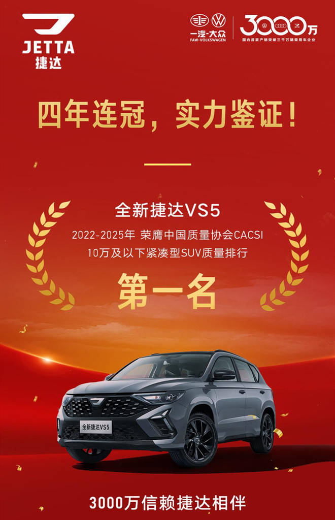 在由中国质量协会发布的汽车用户满意度测评(CACSI)中,捷达VS5自2022年起连续四年荣获“10万及以下紧凑型SUV”用户满意度第一名,彰显了其卓越的产品力;同时,捷达VA3和VS7等车型也多次在各自细分市场获得用户满意度第一,成为520万车主奋斗路上最忠实的伙伴。