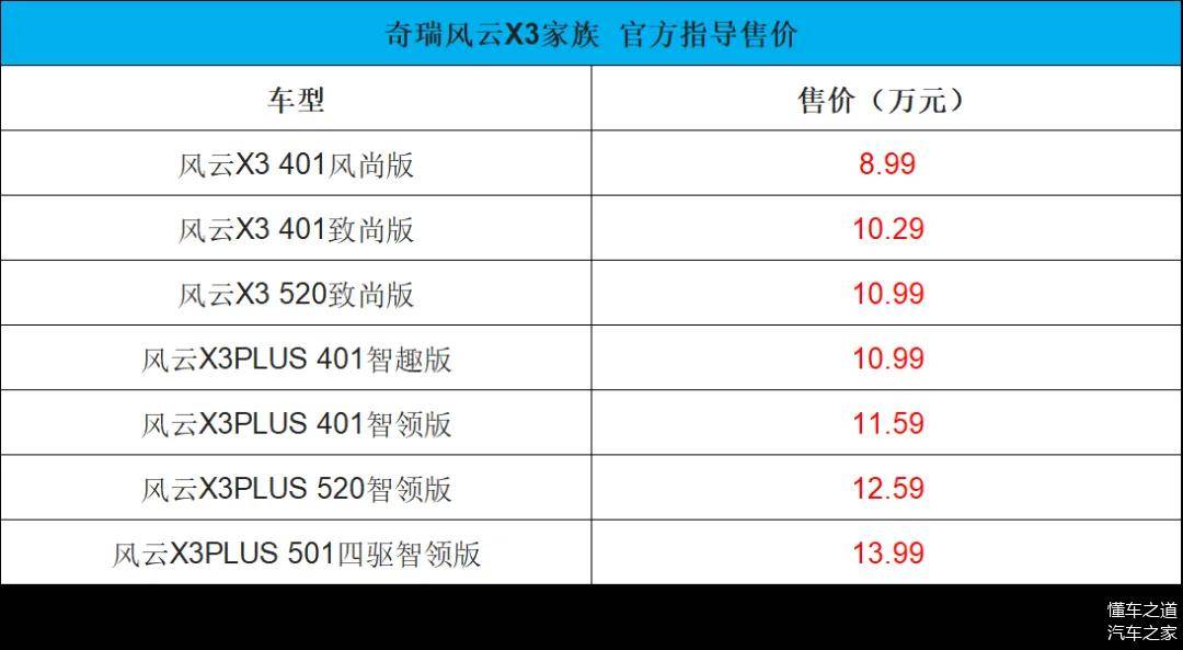 10月20日,奇瑞风云X3家族里的风云X3和 风云X3 PLUS在深圳发布上市,其中,风云X3有3款车型,指导价区间8.99-10.99万元;风云X3 PLUS共4款车型,指导价区间10.99-13.99万元。