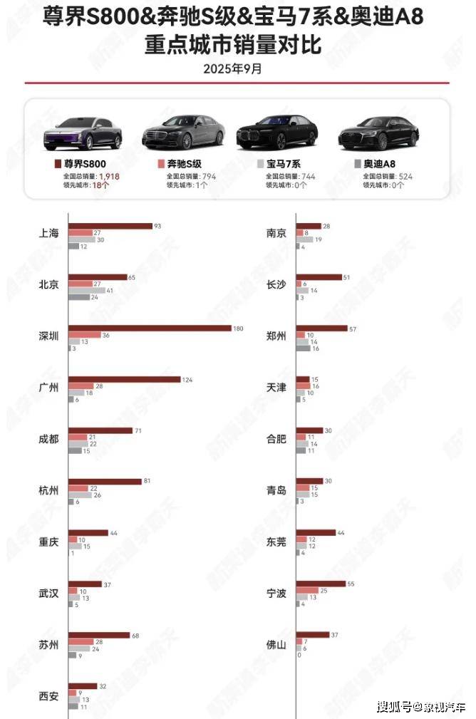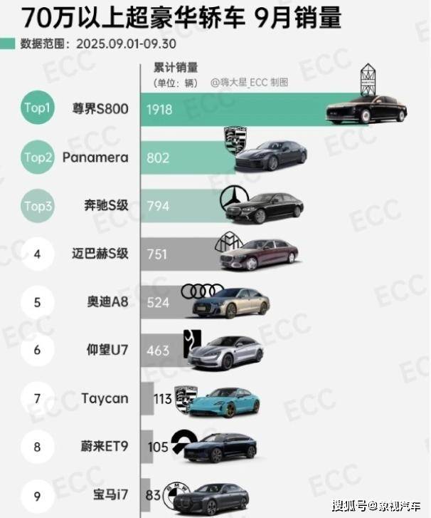 70万以上超豪华轿车9月销量排行榜显示,尊界S800不仅以1918 台的销量稳居榜首,而且还拥有断层式领先优势。