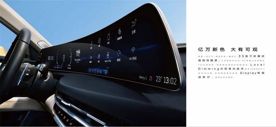 超高清智舱:33英寸9K环幕屏(100000:1对比度+10亿色显)搭配高通8155芯片,显示效果与流畅度碾压奥迪A6L的三屏系统;