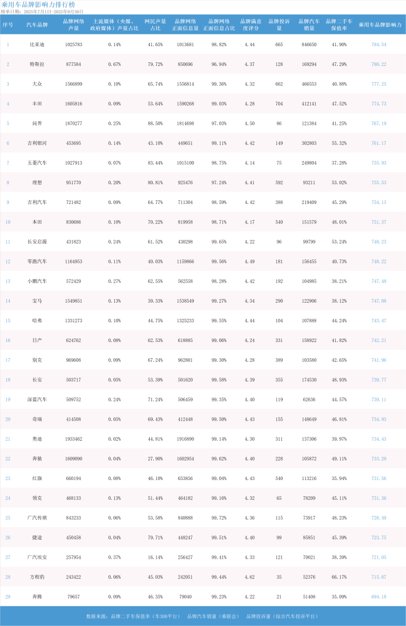 三季度乘用车品牌影响力排名显现出显著的结构性变化,其中,比亚迪以784.54分的综合得分蝉联榜首,其核心竞争力不仅体现在84.67万辆的压倒性销量规模,更得益于98.82%的正面信息占比所形成的卓越用户口碑,这种销量与口碑的双重优势彰显出其在新能源领域深厚的技术积淀与市场认可度。