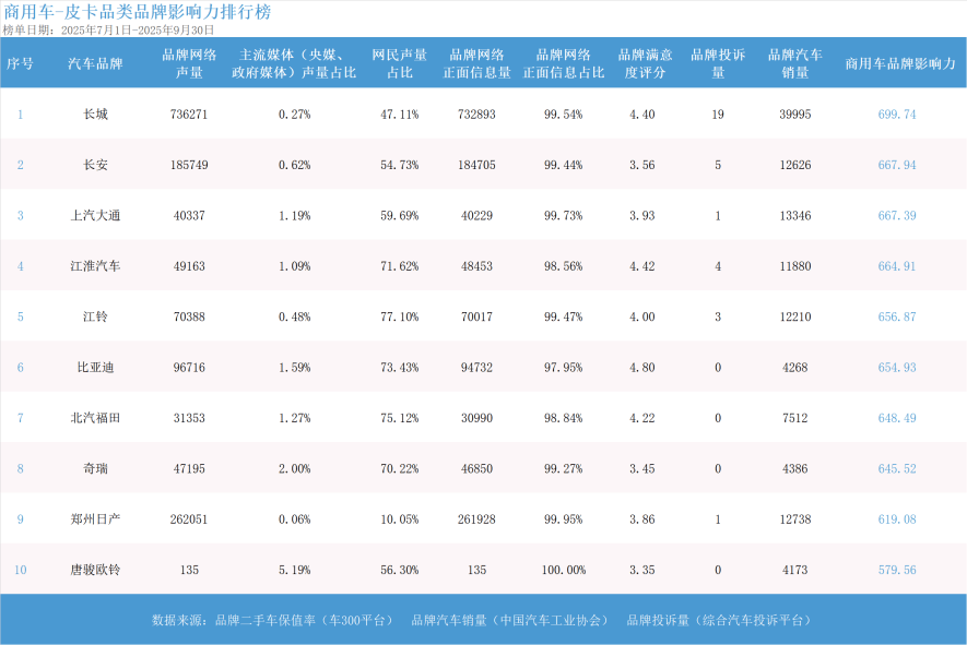 皮卡领域的竞争格局呈现出多元化特征,长城以699.74分继续保持绝对领先地位,73.63万网络声量远超其他品牌,3.99万辆销量与99.54%的正面信息占比构筑了坚实的市场基础;以667.94分位列第二,其0.62%的主流媒体声量占比在同类品牌中表现突出,1.26万辆销量与99.44%的正面率显示出稳健的市场表现;上汽大通则以667.39分排名第三,99.73%的正面信息占比创造了行业美誉度新标杆,1.33万辆销量与59.69%的网民声量占比体现出精准的用户定位。