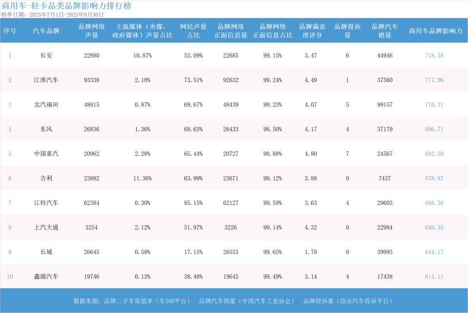 轻卡市场的竞争尤为激烈,长安以718.38分领跑该细分市场,10.87%的主流媒体声量占比显著高于行业平均水平,4.49万辆销量配合99.15%的正面率展现出全面的竞争力;江淮汽车以717.96分的微弱差距位居第二,9.33万网络声量是该细分市场最高,配合4.49的用户满意度与99.24%的正面信息占比,展现出均衡的综合实力;北汽福田则以710.31分位列第三,9.92万辆的销量成绩证明了其市场影响力,4.07的用户满意度与99.23%的正面率保持着稳定的品质输出。