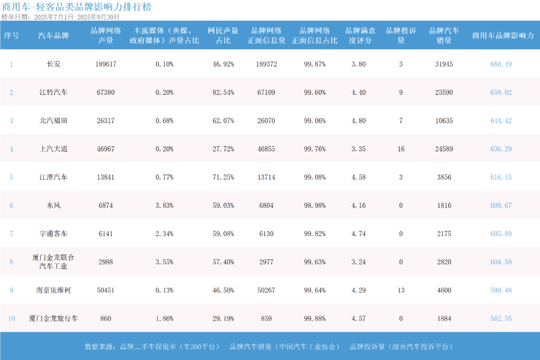 轻客领域保持平稳发展态势,长安以660.49分保持领先地位,18.96万网络声量配合3.19万辆销量展现出强大的市场影响力;江铃汽车以658.02分位居第二,其82.54%的网民声量占比在细分市场中表现最为突出,配合4.40的用户满意度与99.60%的正面率,彰显出卓越的用户口碑;北汽福田以644.42分位列第三,4.80的用户满意度评分成为该细分市场的品质标杆,2.63万网络声量与1.06万辆销量保持着稳定的市场表现。