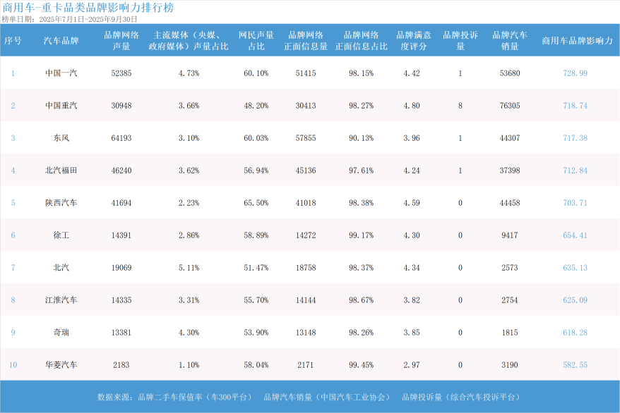 商用车各细分领域在本季度展现出更加明晰的竞争格局,其中重卡市场形成稳固的三强阵营,中国一汽以728.99分位居榜首,其4.73%的主流媒体声量占比远超行业平均水平,配合5.37万辆的销量和4.42的用户满意度,凸显出品牌在国计民生领域的重要地位;中国重汽以718.74分紧随其后,7.63万辆的实际销量位居细分市场第一,配合4.80的用户满意度彰显出卓越的产品实力;东风则以717.38分稳居第三,其6.42万网络声量与4.43万辆销量展现出均衡的市场表现,三者共同构筑了重卡市场的核心竞争圈。