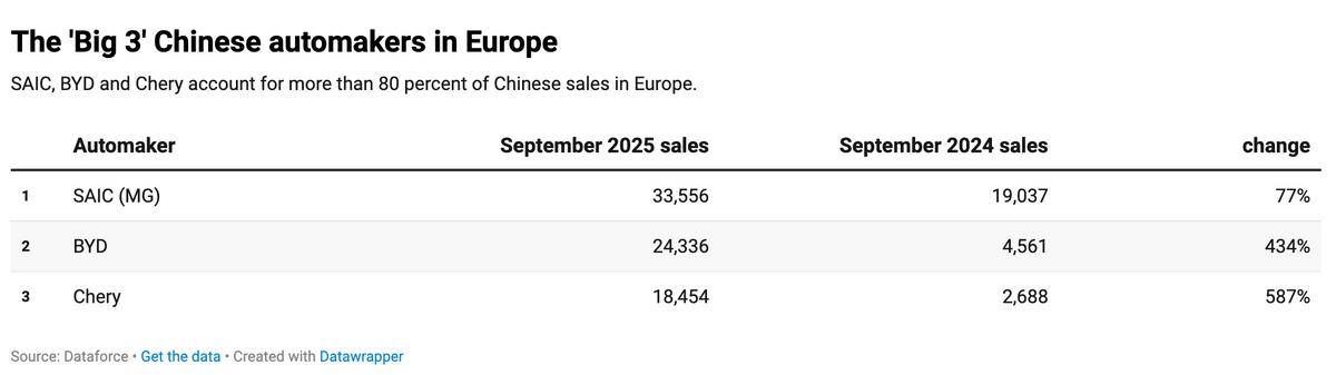 在过去的几年里,欧洲汽车市场一直被德国、法国、意大利等传统汽车强国主导。然而,2025年9月,中国汽车品牌以90,571辆的销量,在欧洲的销量实现了近乎翻倍的增长,同比增长149%,在整个欧洲市场的份额跃升至7.4%。相比去年同期的3.3%,这个增长是惊人的,也充分展示了中国车企在欧洲市场的逐步崛起。