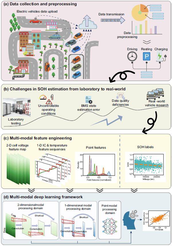 新能源汽车(NEV)动力电池的健康状态(SOH)在服役过程中发生衰退,导致可用容量降低、峰值功率下降,影响整车服役状态和车辆用户的使用体验。这些问题为零部件供应商生产制造、整车厂家预测运维和第三方后市场服务带来了挑战。针对现有技术瓶颈,面向紧迫的产业需求,团队与中国汽车工程研究院有限公司、长安汽车、赛力斯汽车、比亚迪等企业开展紧密的产学研协同攻关,同时与建立了密切的学术合作关系,提出了基于多模态深度融合框架的SOH评估与预测模型。