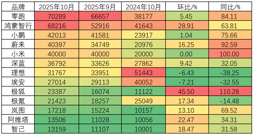 与九月相比,十月的新势力销量榜单变化多了一些,不只突破四万辆的品牌从四家增长到五家,零跑和鸿蒙智行更是将新势力月交付数量提升到了新的高度。