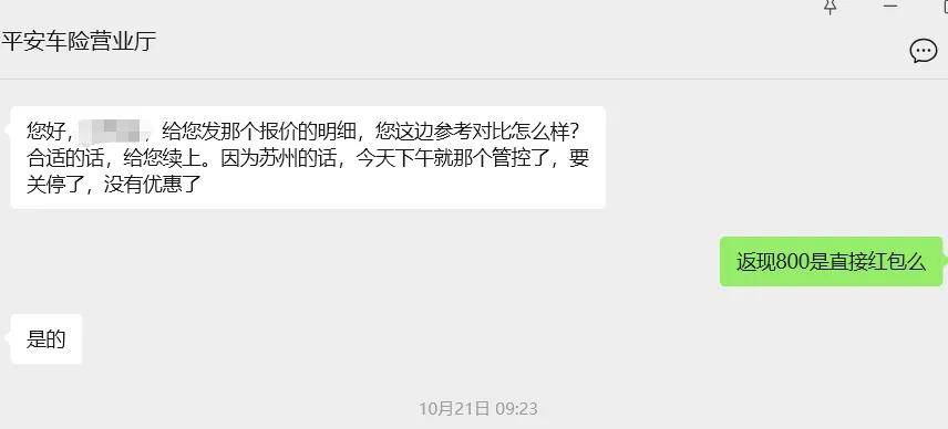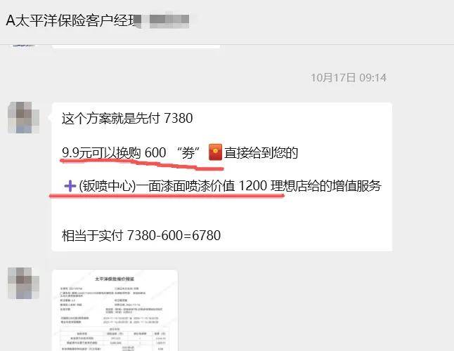 而太平洋财险和平安财险的销售提供返现,分别为600 元“换购劵”和800元现金,以红包形式直接发放,其他增值权益则比较少。