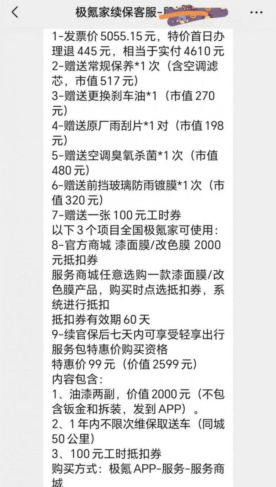 例如,一位极氪车主列出的清单显示,其保费不仅可返现445元,还额外获赠保养服务、刹车油以及多种类型的抵用券。