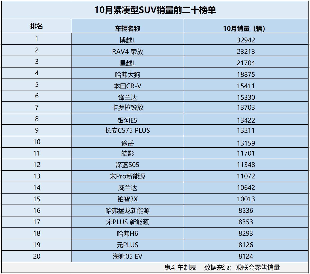 鬼哥根据乘联会零售销量数据整理出10月紧凑型SUV销量排名前二十的榜单,榜单上,共有15款紧凑型SUV销量突破万辆。