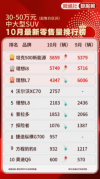 10月中大型SUV最新零售量榜单出炉,30-50万元起售价区间的市场竞争格局显现新变化。