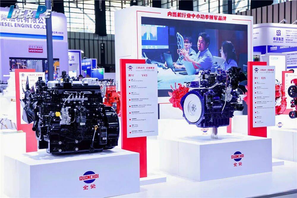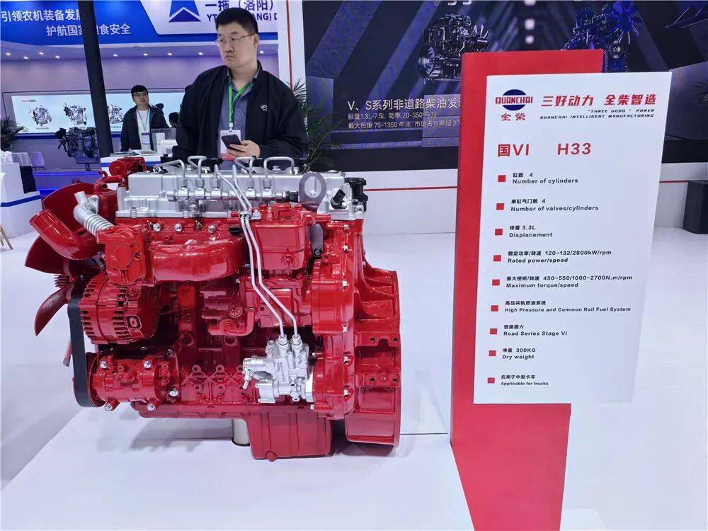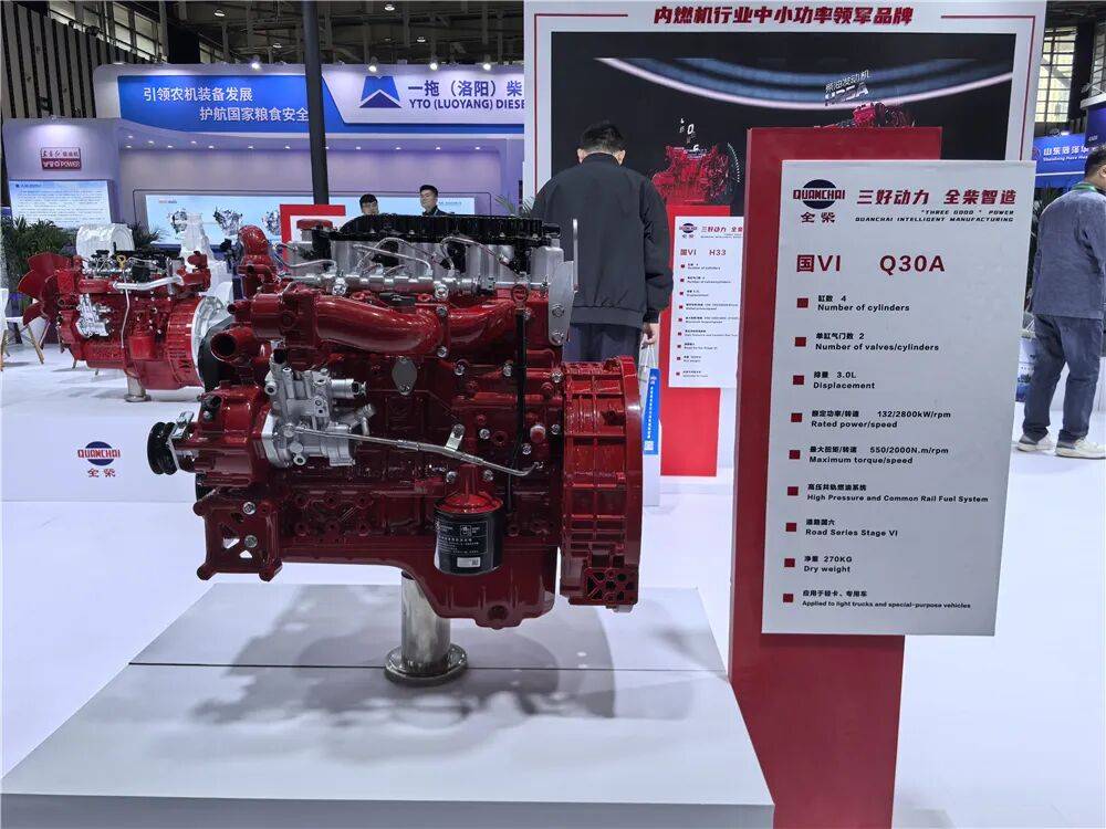 全柴则带来了涵盖Q、H、F、V、S多个平台的产品,其中Q平台和H平台是全柴核心产品线,包括Q25A、Q30A、H33三款柴油动力,主要配套于小卡、轻卡、中卡及专用车,此外还有Q平台的增程发动机,主要面向轻卡,排量2.3L,采用三相永磁同步电机。