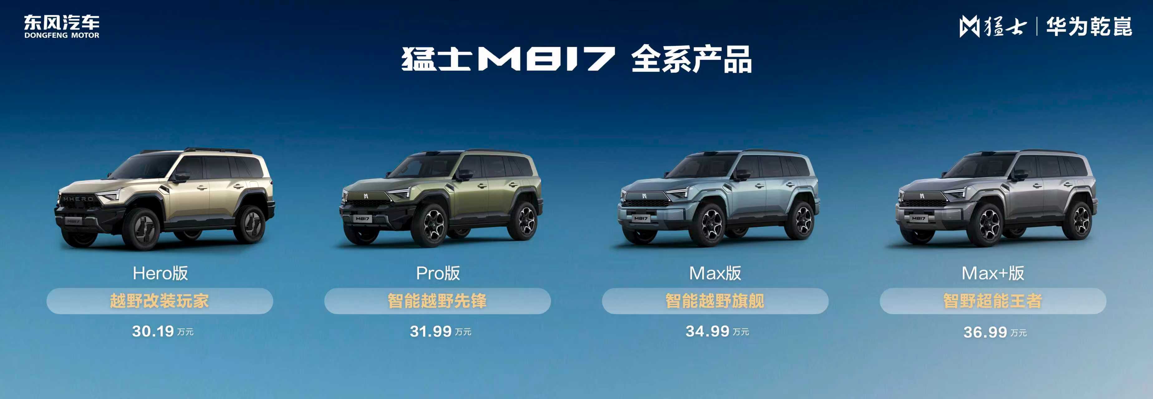 8月上市的M817 Pro版,Pro版,是首搭华为乾靠智驾ADS4的"智野先锋”;9月底推出的M817 Max+版,搭载纯电续航215公里的宁德时代骁遥电池,实现“一次充电,畅行一周”的长续航,解决了新能源越野的痛点;而此次发布的猛士M817 Hero版,则进一步强化改装拓展能力,提供20+原厂后装件,支持拖挂资质与深度个性化升级,满足极限越野爱好者的需求。