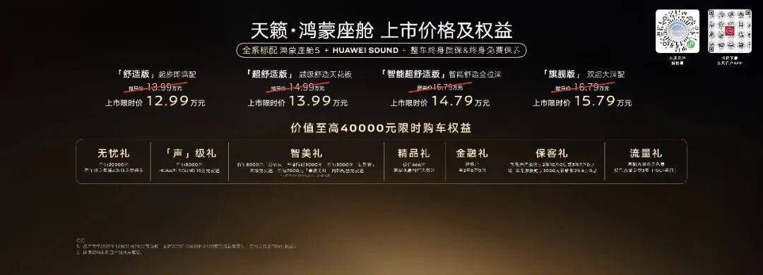 为诚挚回馈首批用户,天籁·鸿蒙座舱特别推出超级置换金1万元,上市限时诚意价12.99-15.79万元,全系标配鸿蒙座舱5及HUAWEI SOUND,让智能舒适的用车体验更加触手可及。