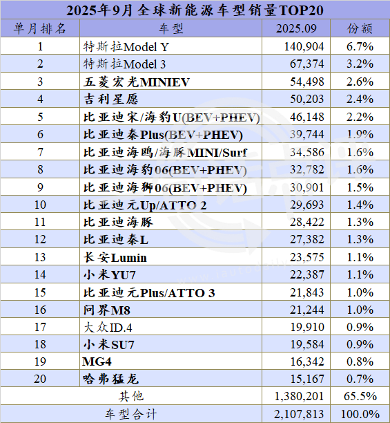 ●小米YU7以2.2万辆首次上榜,接下来随着产能的不断爬坡,它肯定会成为全球新能源单月和累计榜单的常客。