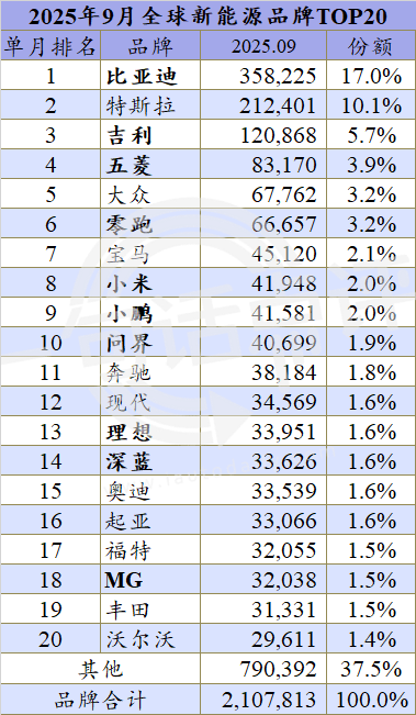 跟随着车型榜的变化,9月全球新能源热销品牌榜单也出现了一些变动。