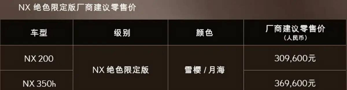 2025广州车展于今日开幕,雷克萨斯发布了“NX绝色限定版”,这款车的官方售价为30.96-36.96万元,目前已经开启预售,该车主要针对年轻女性用户打造,拥有专属的颜色以及细节配置。