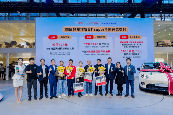 11月25日,在2025广州国际车展上,由京东、广汽集团与宁德时代三方共同推出的“国民好车”埃安UT super举行首批车主交付仪式,宣布新车开启尾款支付,并正式进入全面交付阶段。京东汽车营销总经理陆欢,时代电服营销副总裁邓旭,广汽集团党委副书记陈小沐,广汽集团埃安BU副总裁、埃安品牌首席用户官杨龙,埃安BU市场部部长、埃安UT用户营销官张伟,广汽埃安UT车型总经理涂序聪等领导出席本次交付活动。值得关注的是,广汽埃安全国一级门店、京东养车北京综合服务中心也于同日开启首批车辆交付,标志着国民好车交付中心服务网络正式落地启用。