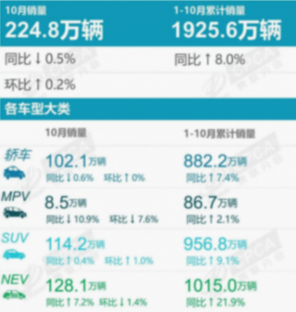 从细分市场来看:10月份,轿车市场销量为102.1万辆,同比下滑0.6%,环比持平;SUV市场销量为114.2万辆,同比增长0.4%,环比增长1.0%;MPV市场销量为8.5万辆,同比下滑10.9%,环比下滑7.6%。而新能源市场销量达128.1万辆,同比增长7.2%,环比下滑1.4%。