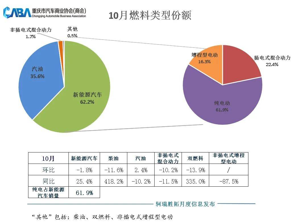 从10月销售车型的燃料类型来看,燃油车销量占比为35.6%,新能源汽车销量占比达到62.2%。10月份,新能源汽车销量同比增长25.4%,其中纯电车型占比新能源销量达61.9%,相比9月份略有回落。