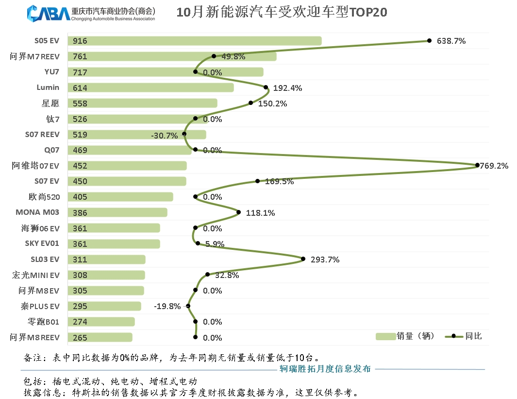 在10月份新能源汽车受欢迎车型TOP20来看,深蓝S05纯电版(916辆)、问界M7增程版(761辆)、小米YU7(717辆)分被位居销量前三。