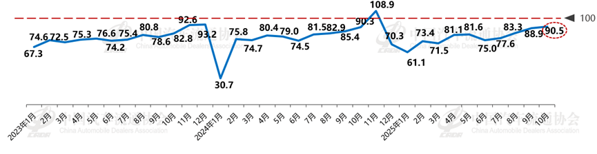 数据显示:10月汽车消费指数为90.5,高于上月。新能源汽车购置税政策政策退坡,驱动潜在消费者提前释放购车需求。同时,临近年末,经销商为冲刺年度销量目标,将加速销售进程。然而,目前有部分地区调整或暂停置换补贴政策,可能引发部分消费者持币待购;此外,部分车企推出的“购置税兜底”策略,在一定程度上削弱消费者在年内提车的紧迫性。综合来看,预计11月汽车市场终端零售相较10月将小幅增长。