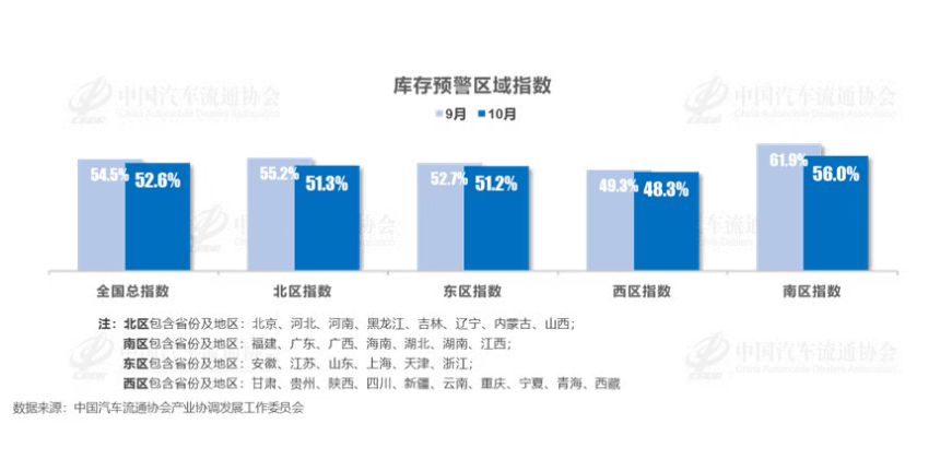 数据显示,10月中国汽车经销商库存预警指数为52.6%,同比上升2.1个百分点,环比下降1.9个百分点。库存预警指数位于荣枯线之上,汽车流通行业景气度有所改善。