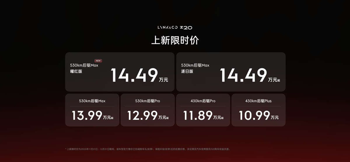 2025年11月21日,“智趣驾享纯电SUV”领克Z20 530km后驱Max曜红版(简称领克Z20曜红版)在广州车展上新发布,上新限时价14.49万元。即日起,用户可登录领克官方APP订购新车,享受包括购车礼、金融礼、焕新礼在内的多重购车权益,2025年11月21日至2025年12月31日期间锁单并提车的前200名用户,还可获赠价值666元的“LYNK & CO Z20 × 非必要不合作Nidea·Nlight 联名电气灯”。