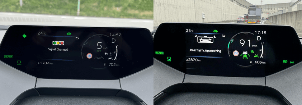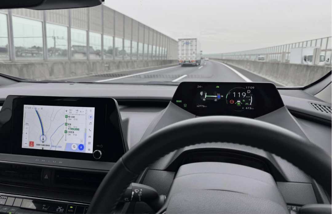 驾辅系统,普锐斯标配Toyota Safety Sense 3.0配置包,内容是前向毫米波雷达外加单目摄像头,可以实现ACC Stop-Go以及简单的L2级驾辅功能。亮点功能是前车起步提示以及信号灯变化提示功能,而且还可以配合内饰灯条亮度加以提示,此外还有后方来车提示以及路口横穿路人警示功能。