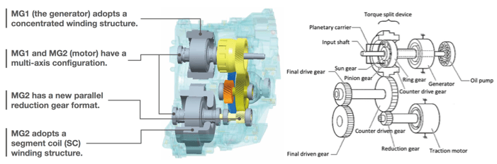 THS动力系统代号在普锐斯上变更为PB10/PB12,前者HEV,后者PHEV。结构上依然是径向布置的双电机PowerSplit耦合器外加行星轮系传动。主要差异在于: