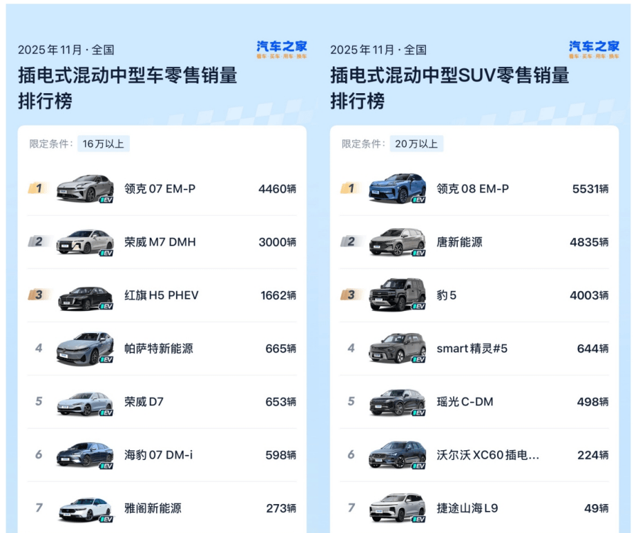 紧随其后,全新领克08 EM-P于2025年9月24日上市,同样势如破竹,次月即实现整车10000台下线,并迅速完成万台交付。同年11月,其销量也跃居全国20万以上级插电式混动中型SUV月度销量榜首。