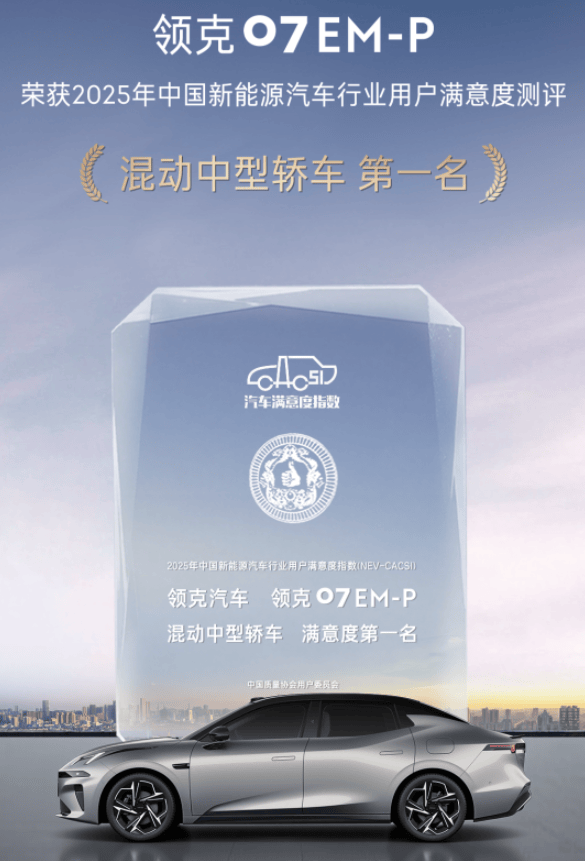 正是这种对品质的极致追求,让领克07 EM-P荣获了2025年上半年插电混动中型车保值率Top1称号,并在同年12月摘得2025年中国新能源汽车行业用户满意度指数(NEV-CACSI)“混动中型轿车”用户满意度第一名。行业的高度认可,也让“超电双子星”在短时间内赢得了165万用户的信赖。