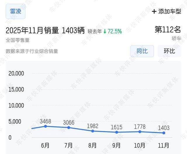看了一下最近半年雷凌在国内的销量数据,已经连续4个月单月销量都在2000辆以下了。其中11月销量仅为1403辆,环比下降21%同比降幅更是高达72.5%。
