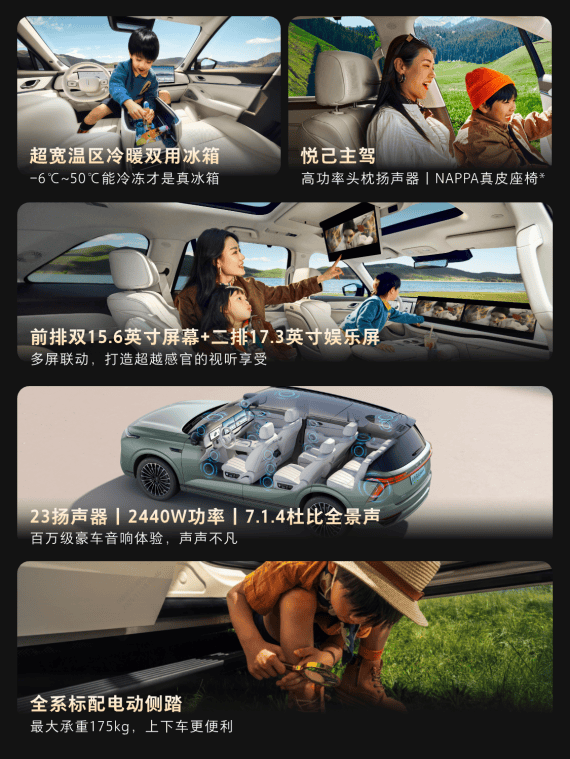 车内布局延续了六座SUV的平权理念。主驾配备八点按摩,副驾设有一键零重力模式,二排为带腿托的“头等舱”座椅,第三排也可满足成人坐躺需求。此外,车辆搭载-6℃-50℃温控的7L车载冰箱,以及支持7.1.4全景声的23扬声器音响系统。后排17.3英寸3K娱乐屏配合AI多屏扩画、晕动舒缓显示等功能,旨在缓解行车中的视听不适。