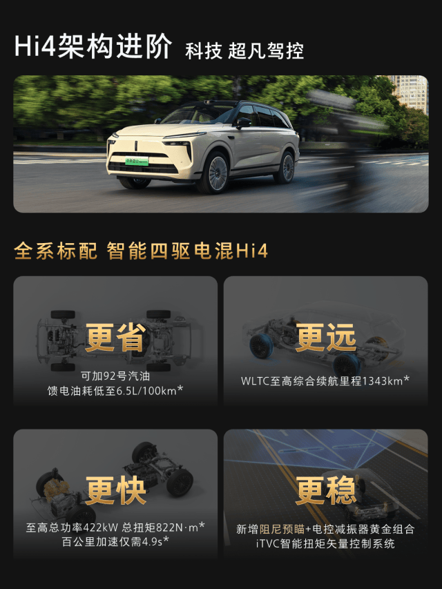 动力方面,全新蓝山智能进阶版搭载了Hi4性能版智能四驱电混技术,采用全球首创的四挡全速域直驱设计。其官方数据显示,车辆在实现4.9秒零百加速的同时,馈电油耗仅为6.5L/100km,综合续航可达1343km。通过前后50:50轴荷分配与iTVC智能扭矩控制,该系统旨在兼顾性能与能耗,配合底盘阻尼预瞄功能,可提前识别减速带并调整悬挂软硬,提升行驶舒适性。