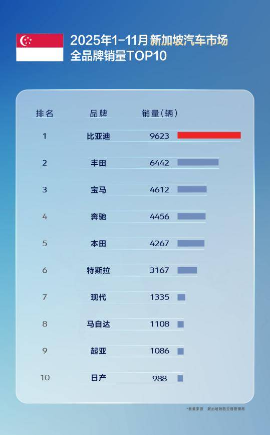11月,比亚迪在巴西、土耳其、意大利、西班牙、匈牙利、克罗地亚等国拿下了新能源汽车销量第一,在新加坡等国家获得全品牌销冠。1-11月累计表现同样不俗,在巴西、土耳其、西班牙、意大利等国,比亚迪位列新能源汽车品牌销量榜首;在新加坡、中国香港等地区市场荣膺全品牌销量第一,备受消费者认可。