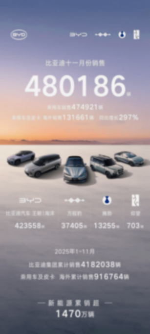11月,比亚迪集团单月销售480,186辆,持续突破再创年内新高;乘用车贡献474,921辆,稳健如初。纵观2025年1-11月,比亚迪集团累计销售突破418万辆,同比增长11.3%,已完成年度销量目标的91%,超越去年已经毫无悬念。