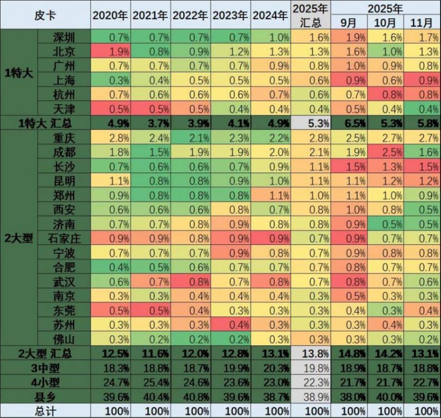皮卡市场主力销售区域还是在以中小城市和县乡市场为主,但随着电动化皮卡和乘用化皮卡推出,大城市需求得到改善。2025年11月深圳等限购市场表现较好,而县乡市场近期大幅走强,燃油皮卡的大城市市场目前来看并没有明显的突破特征。11月的县乡市场的表现相对回升较大。
