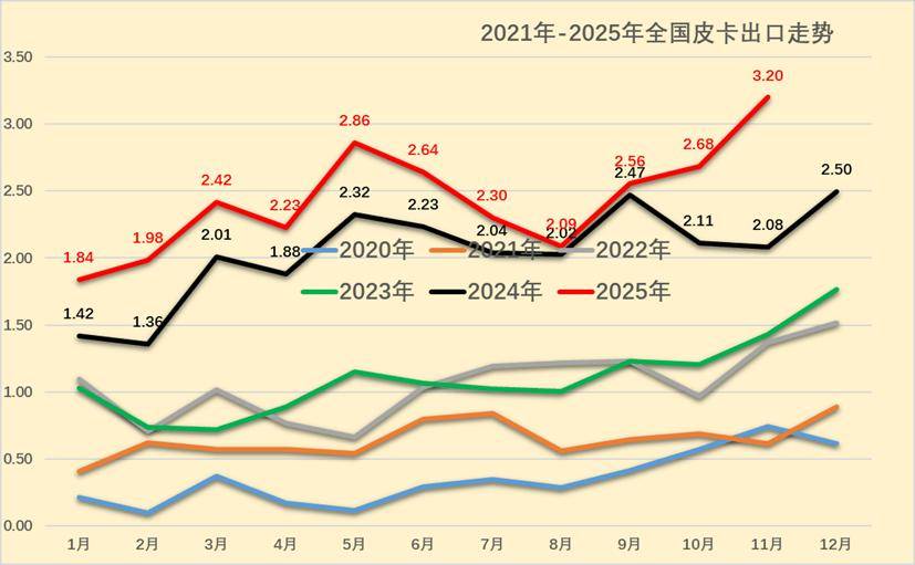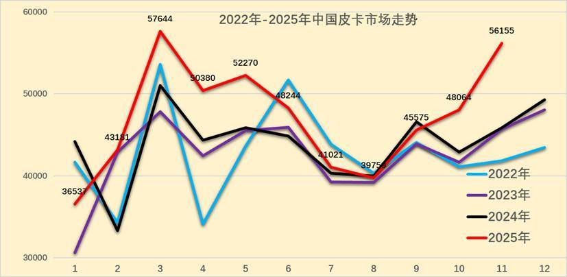 2025年皮卡批发市场走势不断变化,年末走强明显。相对于历年的春节早,因此2025年2-3月的皮卡走势因春节较晚因素获得增量,4-8月的皮卡销量逐步下滑,10-11月出口销量回升明显。
