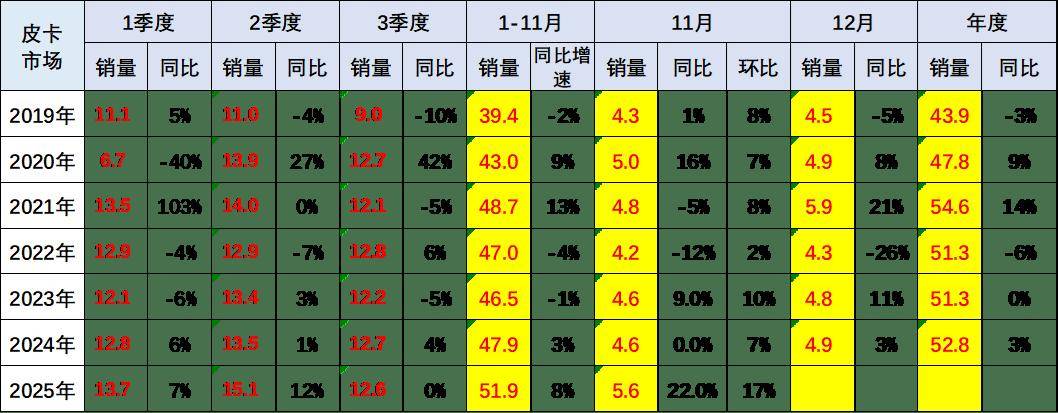 2025年11月份皮卡市场销售5.6万辆,同比增长22%,环比增长17%,处于近5年的高位水平。2025年1-11月份皮卡市场销售51.9万辆,同比增长8%。