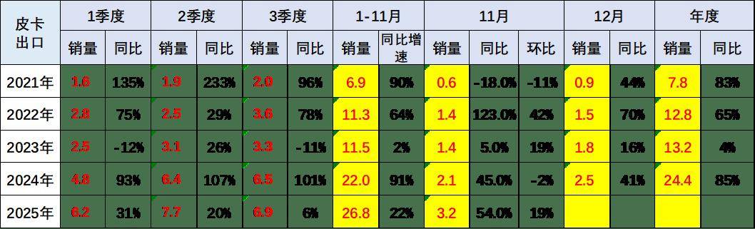 全国皮卡市场2024年累计出口24.4万辆,增速85%。今年以长城汽车为代表的皮卡总体行业出口超强,2025年11月全国皮卡出口3.2万辆,同比增长54%,环比增长19%,行业出口占比继续保持高位。1-11月皮卡出口26.8万辆,同比增长22%。2024年皮卡出口占比皮卡总销量的45%,2025年11月皮卡出口达到57%,2025年1-11月皮卡出口达到52%,中国自主皮卡出口提升较好。作为国际化车型的皮卡,已成为我国商用车出口中的最强品类。