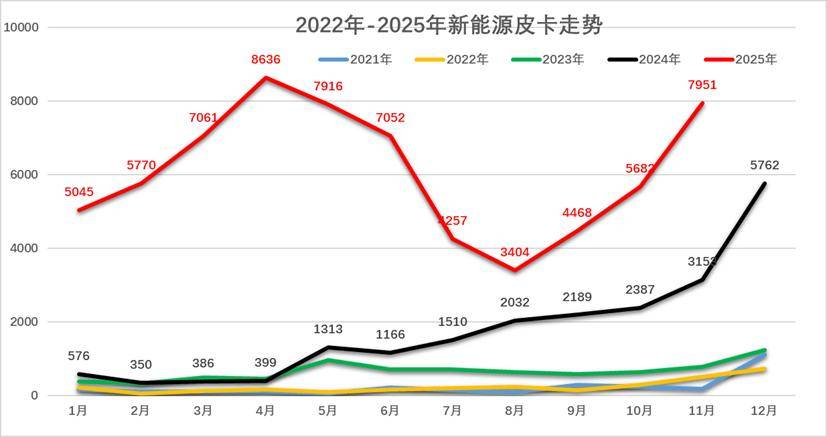 2024年全国新能源皮卡销量2.12万辆,同比增长170%;2025年11月新能源皮卡0.8万辆,同比增长152%,环比增长40%;1-11月累计新能源皮卡6.7万辆,增长335%,形成超强于皮卡总体增速的较好走势。