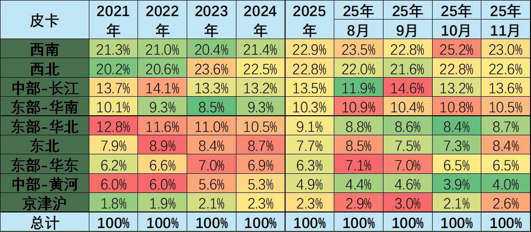 皮卡市场的主力区域在西南、西北为主,西部地区的皮卡需求较大,而东部发达地区的新能源皮卡带动市场增长较好。目前来看,2025年11月西南、西北地区的皮卡需求占到总体需求的46%左右,成为两大核心市场,其中今年西南市场规模较大。