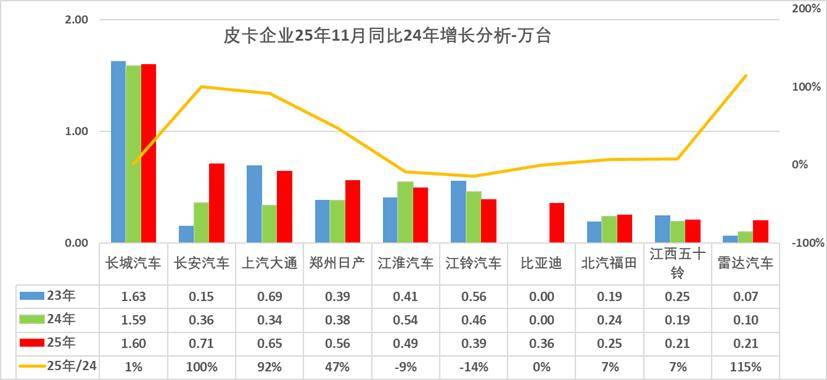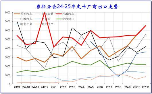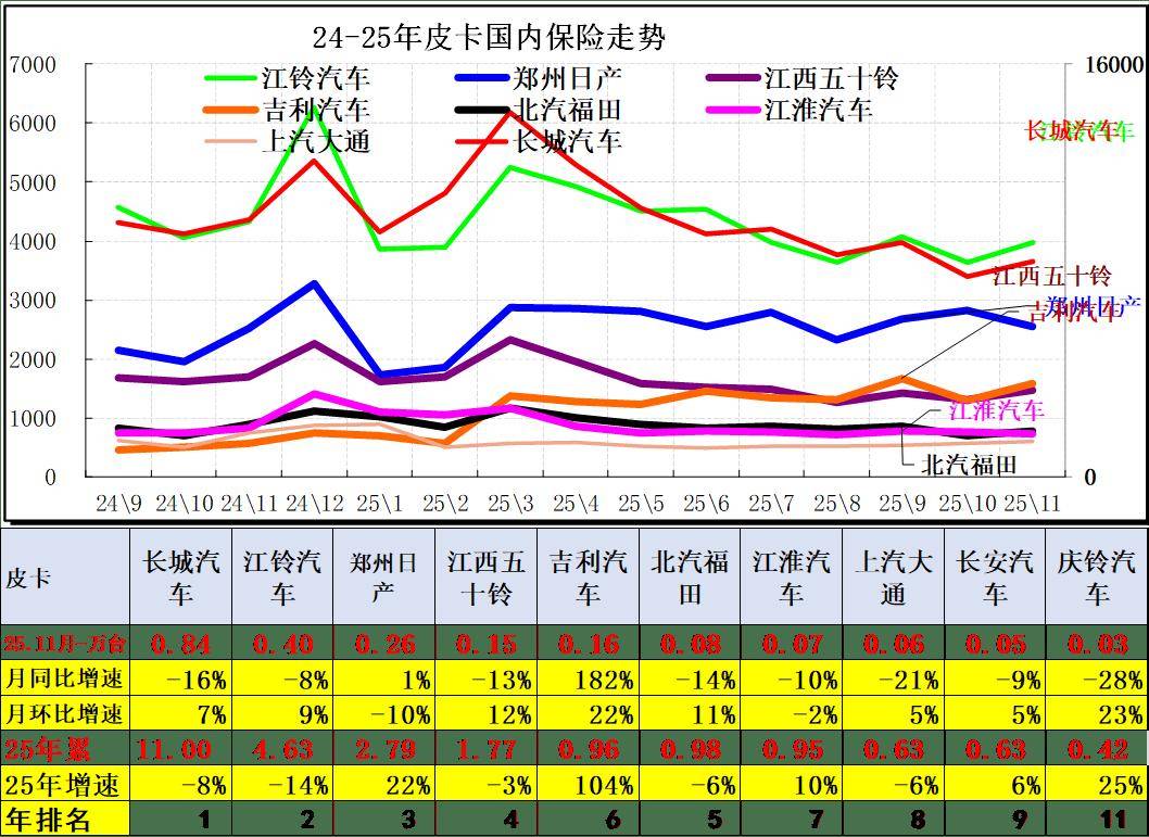 2025年皮卡市场主力厂商表现仍较好,长城汽车皮卡保持较强的绝对优势地位,长安汽车、上汽大通、郑州日产等11月走势较强。